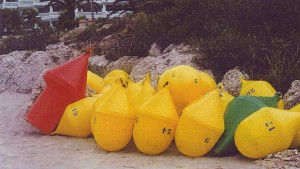En un artículo anterior comentamos la obligatoriedad de balizar las playas. Aquí vamos a dar algunas recomendaciones en caso de tener que hacerlo. El Real Decreto 1685/83, de 25 de mayo, adopta para las costas españolas el Sistema de Balizamiento Marítimo de la Asociación Internacional de Señalización Marítima (AISM). Es curioso observar cómo la Resolución de 2 de septiembre de 1991, de la Dirección General de Puertos y Costas (RB-91) (que establece las características técnicas del balizamiento de playas, lagos y superficies de aguas interiores), de aparición posterior, no recoge en su integridad algunas consideraciones contenidas en dicha norma. Las boyas que señalizan la zona marítima de baños deben ser esféricas y de color amarillo, por tratarse de marcas especiales y para no confundirlas con las de navegación, según la AISM. Estas boyas que marcan el borde exterior son costosas y difíciles de dimensionar, pues se supone que deben resistir un oleaje en rotura de gran intensidad.