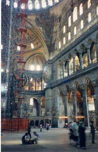 Santa Sofía se alzó entre los años 532 y 537 sobre una primitiva basílica incendiada en el mismo 532. Desde el primer momento, el emperador Justiniano I decidió construir una basílica completamente diferente, más grande y más majestuosa que sus predecesoras. Para ello mandó llamar a dos ingenieros militares, Isidoro de Mileto y Antemio de Tralles, confiando en ellos las innovaciones necesarias para asegurar su grandiosidad. En el edificio trabajaron más de diez mil obreros. Con todo, la gran cúpula se hundió en el terremoto del 558 y se tuvo que reconstruir, entre los años 558 y 562 por Isidoro el Joven, sobrino del de Mileto.