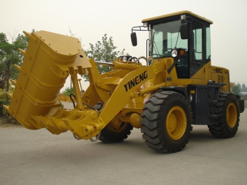 La cargadora con cuchara de volteo lateral se caracteriza por realizar el proceso de carga en la parte frontal del equipo, pero la descarga se realiza por su parte lateral. El diseño permite cargar con la máquina en paralelo al camión en lugares de poco espacio, vaciando la cuchara en sentido lateral.