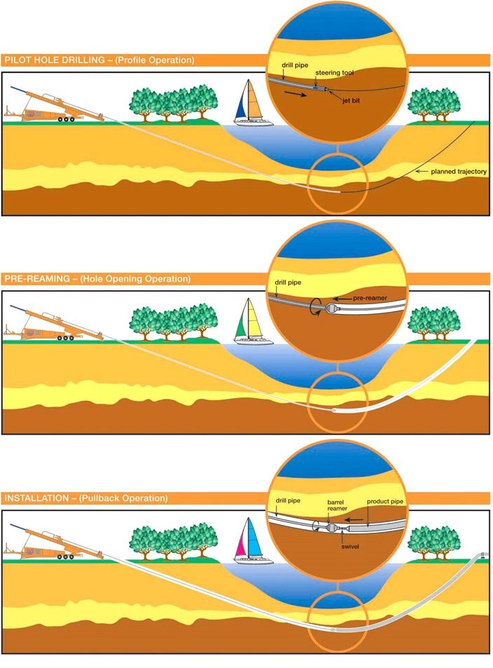 Esta tecnología opera mediante una máquina que perfora el suelo a lo largo de toda la trayectoria de la instalación, siendo orientada y seguida desde la superficie mediante un localizador que indica la posición, sin necesidad de pozos verticales, ya que la obra comienza desde la superficie.