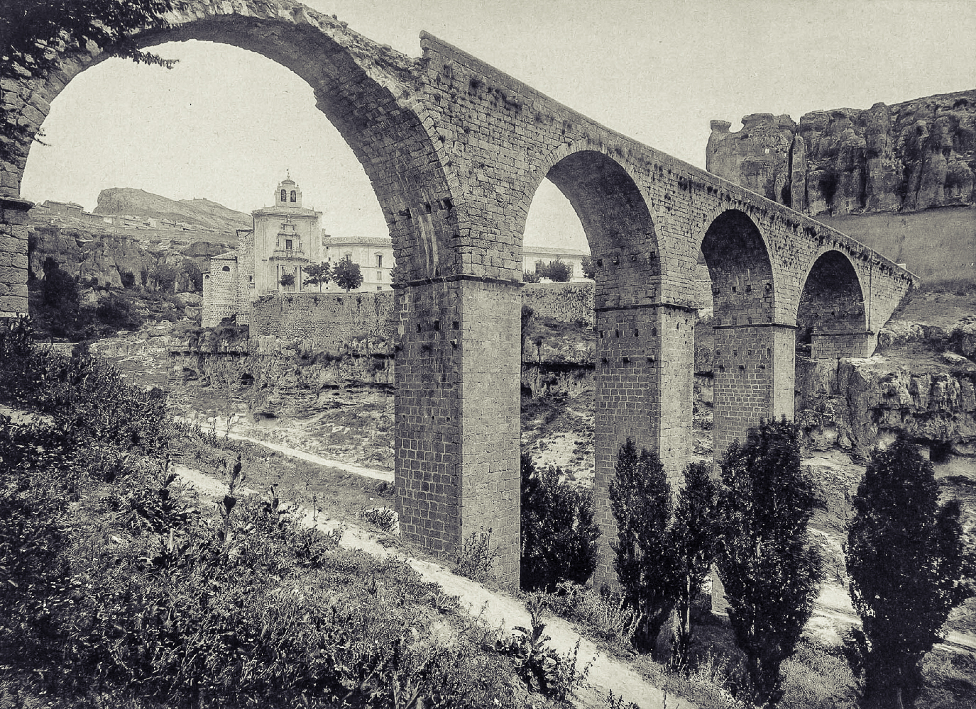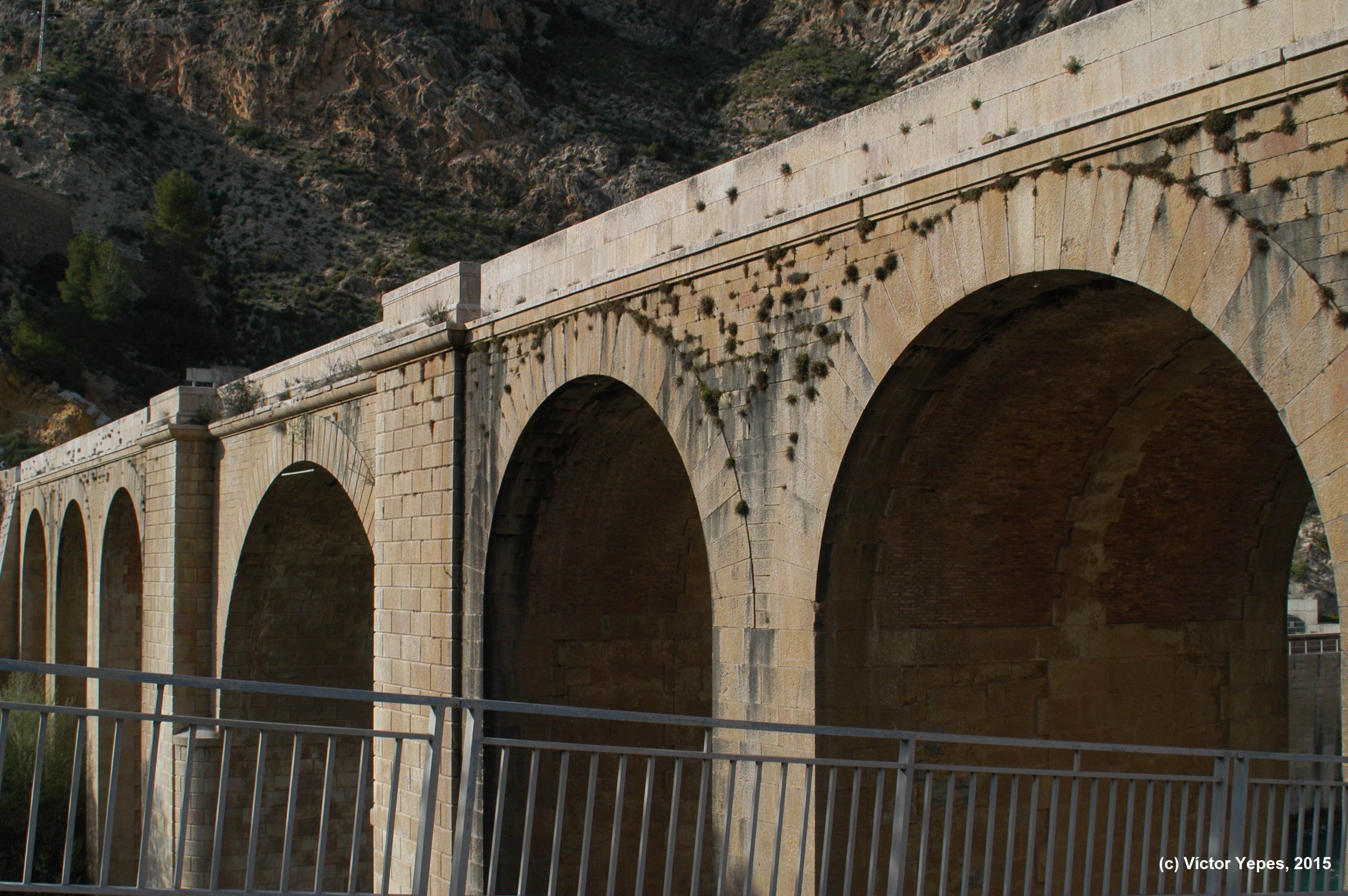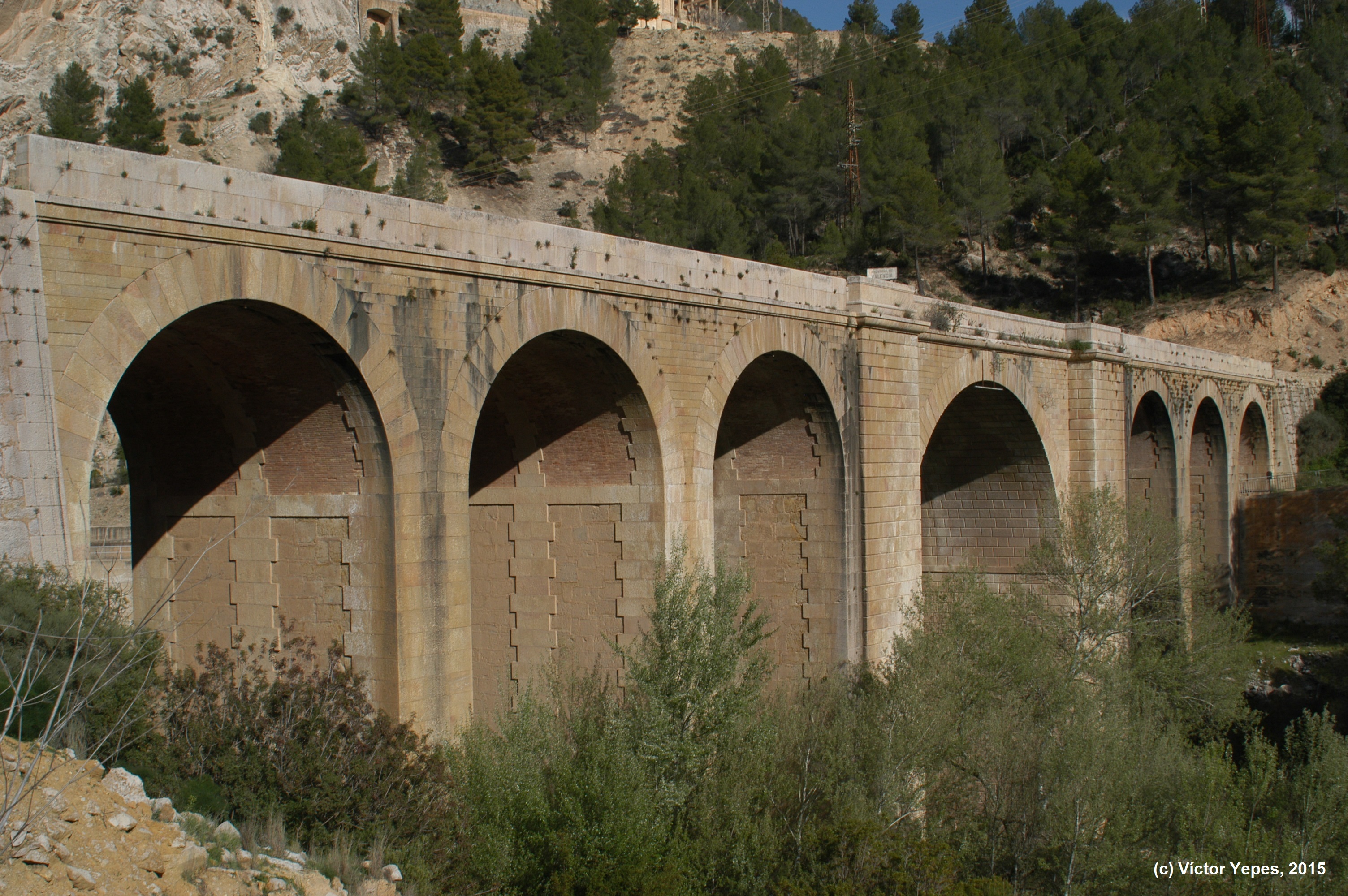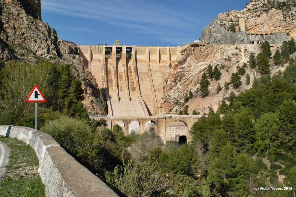 Puente del Cabriel, en la carretera Madrid-Valencia, por las Cabrillas. José Martínez Sánchez (fotógrafo). Hacia 1866. Copia a la albúmina. WikipediaPuente del Cabriel, frente aguas abajo de la presa. Imagen: V. Yepes, 2015