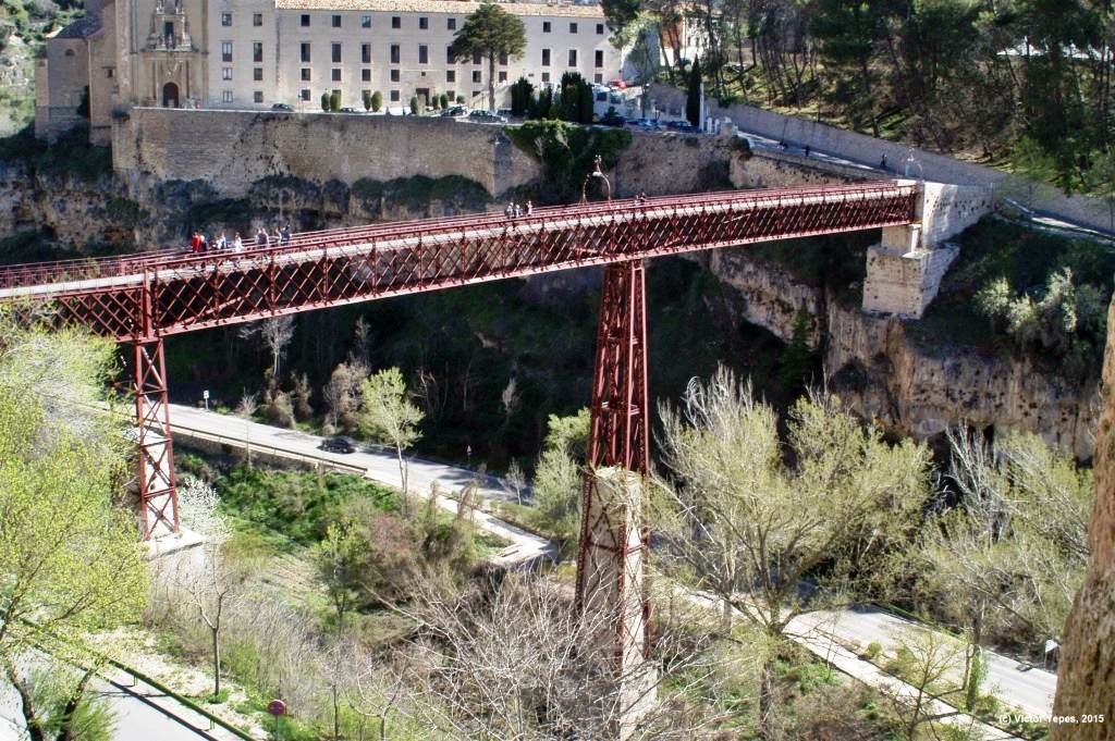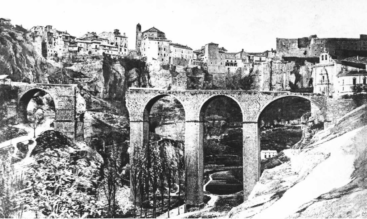 El puente primigenio de San Pablo se construyó entre 1538 y 1589 por orden del canónigo Juan del Pozo para comunicar el Convento de San Pablo y el casco urbano de Cuenca, a su paso por el río Huécar. Elefante de cinco patas, como le llamó Pío Baroja, este puente era de piedra con cinco arcos apoyados sobre cuatro pilares, de los que aún quedan algunos restos. El hecho de que llevara tantos años construir dicho puente explica la cantidad de maestros que pasaron por la dirección de sus obras, como Francisco de Luna, Andrés de Vandelvira, Juan Gutiérrez de la Hoceja, Juan de Palacios, Hernando de Palacios y, finalmente, Juan de Meril. Sin embargo, el hundimiento progresivo de las pilas provocó la rotura sucesiva de los arcos. El puente de piedra se vino abajo en 1786, en la parte más próxima a la catedral, y aunque fue reparado por el arquitecto Mateo López en 1788, no se logró impedir el desmoronamiento del segundo arco. Su último episodio ocurrió en 1895, lo que llevó a tomar la decisión de su total demolición.