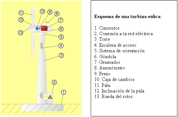 El aerogenerador se compone de tres partes: torre, rotor y álabes. En el generador eléctrico es donde se transforma el movimiento mecánico del rotor en energía eléctrica. Suele ser un generador asíncrono o de inducción, con una potencia máxima entre 500 y 1500 kW. Están diseñados generalmente para rendir al máximo a velocidades alrededor de 15 m/s. En el caso de vientos más fuertes es necesario gastar parte del exceso de la energía del viento para evitar daños en el aerogenerador. En consecuencia todos los aerogeneradores están diseñados con algún tipo de control de potencia. Los componentes de un aerogenerador están diseñados para durar 20 años. Esto significa que tendrán que resistir más de 120.000 horas de funcionamiento, a menudo bajo condiciones climáticas adversas (Gálvez, 2005). Respecto a las torres eólicas, se distinguen las “onshore”, instaladas en tierra, normalmente en grandes llanos o zonas elevadas y las “offshore”, cuya localización es dentro del mar, en zonas próximas a la costa.