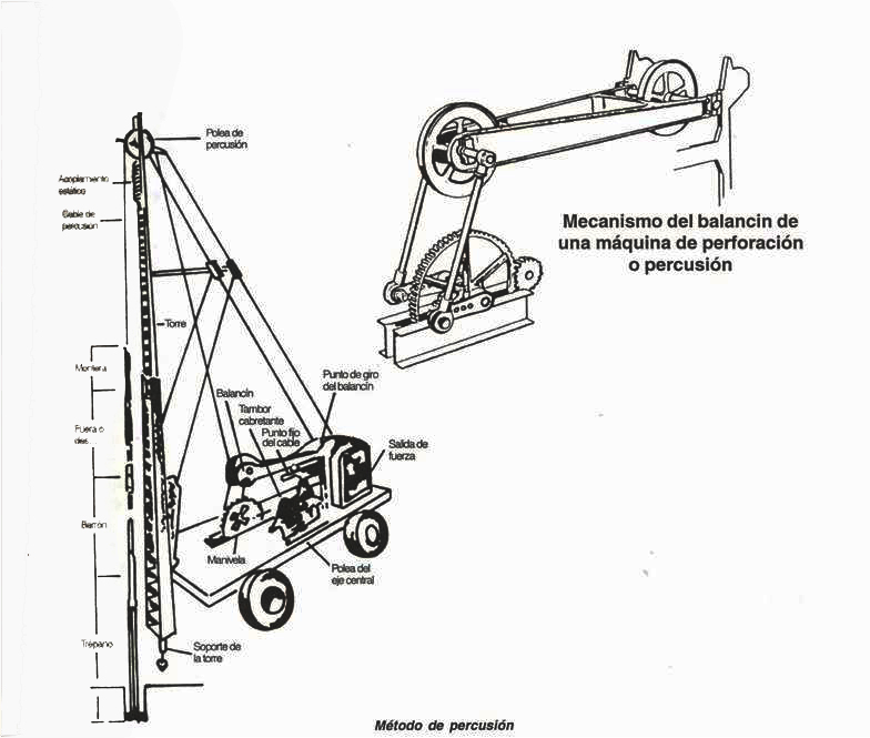 La perforación a percusión con cable se basa en el golpeteo con una pesada herramienta de corte (trépano) que se eleva con un cable y que cae por gravedad, fragmentando el suelo. Resulta evidente, por tanto, que los sondeos realizados por esta máquina deben ser verticales.