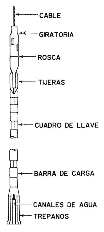 • Barra de carga o barrón: Es una barra cilíndrica de acero forjado que provee a la sarta de perforación del peso necesario y también guía el movimiento alternativo de la sarta. Lleva en su parte inferior una rosca hembra para recibir la rosca macho del trépano, y en su parte superior una rosca macho que conecta con la tijera o montera en su caso. Su longitud varía entre 3 y 5 m, con un peso entre 400 y 1000 kg.