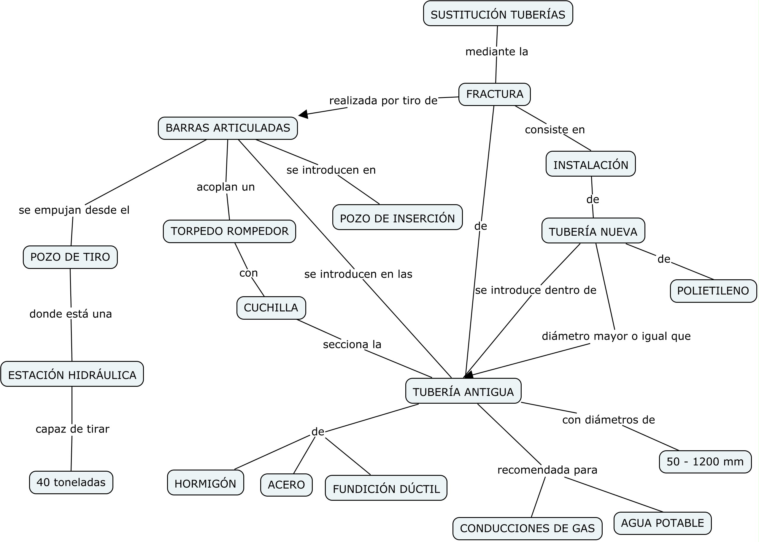 La tubería a reemplazar se rompe con una cabeza de ruptura o se corta con un rodillo de corte. Los fragmentos ocasionados se desplazan contra el terreno circundante y la cavidad se amplía, de forma que un nuevo tubo pueda introducirse en ella. La tubería de substitución puede tener el mismo diámetro que la antigua o incluso mayor. En el caso de que pueda tener un diámetro menor, la técnica de relining sería una alternativa a tener en cuenta.
