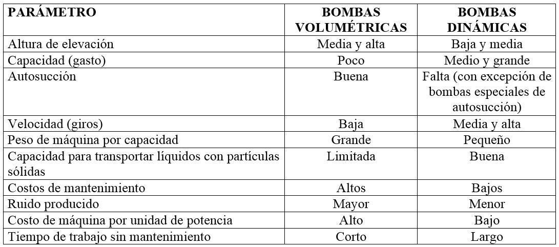 En la Tabla siguiente se comparan las características más importantes de las bombas hidráulicas.