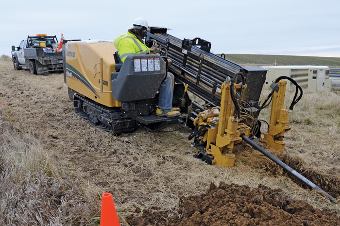 Las máquinas PHD presentan dos características comunes, un soporte que empuja la sarta de perforación para la perforación piloto y luego tira de ella y del tubo durante el ensanchamiento (Figura 4), y un motor que hace girar la sarta de perforación, junto con la cabeza de perforación o de ensanche. El empuje suele ser hidráulico, y la inclinación del soporte está inclinada entre 10º y 20º respecto a la horizontal. Si la máquina se emplaza en un foso, la reacción necesaria la proporcionan las caras de la excavación. Las máquinas de superficie se anclan al suelo para su estabilización.