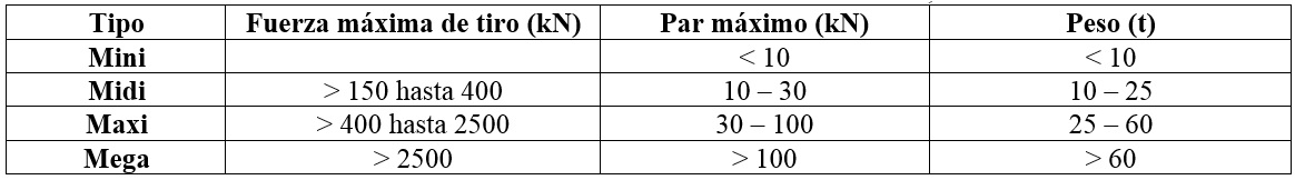 Actualmente existe una gran variedad de máquinas empleadas en la PHD. En la Tabla 1 se recoge una clasificación en función de la fuerza máxima de tiro, el par máximo y el peso (IbSTT, 2013). Más del 90% de las máquinas se pueden clasificar como pequeñas o medianas, con una fuerza máxima de tiro de 250 kN. Con estas características, se pueden colocar diámetros que oscilan entre los 50 mm y los 2200 mm, e incluso llegar a 3 km de conducción si se dan las circunstancias favorables. Aunque las máquinas estándar y más versátiles del mercado suelen tener 500 kN de tracción, las mayores tiran unos 2000 kN. Resulta interesante en este sentido el trabajo de Gierczak (2014) donde se realiza una valoración cualitativa de los riesgos inherentes a los proyectos PHD. Además, estas máquinas presentan una gran variedad de sistemas de guiado, cabezas de perforación, de ensanchamiento y otros accesorios (Figura 2).