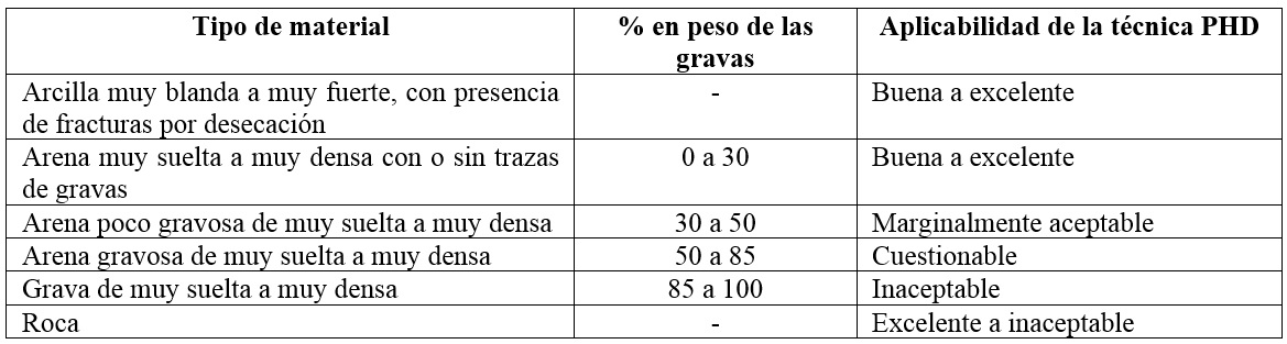Así, lo más favorable son arcillas homogéneas, mientras que los materiales granulares presentan problemas de estabilidad, sobre todo bajo nivel freático. Además, las gravas pueden acelerar el desgaste de la cabeza de perforación. Wang y Sterling (2007) han estudiado el comportamiento de la PHD en arenas flojas o mezclas de arenas y gravas, que son los terrenos más problemáticos. En el caso de roca, las máquinas deben contar con motores de lodos que accionen las cabezas cortadoras. Existen incluso máquinas con doble varilla en el que el tubo interior hacer rotar la cabeza cortadora de roca y el exterior proporciona la dirección de perforación; sin embargo, estas máquinas son de pequeño diámetro y longitud de perforación. Otra opción es combinar la percusión con el empuje y la rotación.