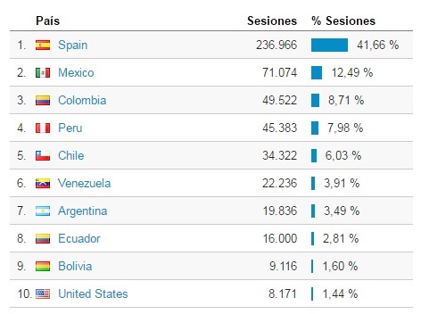 Para que veáis algunos datos, «El blog de Víctor Yepes» tiene, con esta, 718 entradas. La primera entrada, y por tanto el nacimiento del blog fue el 5 de marzo de 2012, es decir, más de cuatro años de travesía de la bitácora. Según Google Analytics, las visitas diarias a mi blog se sitúan entre 500 y 1000. La página tiene en este momento un total de 433.018 usuarios, que han hecho 764.194 visitas. En la figura que os paso tenéis la procedencia de mis visitantes, la mayoría españoles, pero también de México, Colombia, Perú o Chile. Normalmente los usuarios no son sólo mis alumnos, sino alumnos de otras universidades y otros países, así como técnicos de todo tipo. Podéis ver en un post anterior un vídeo donde explico el blog.
