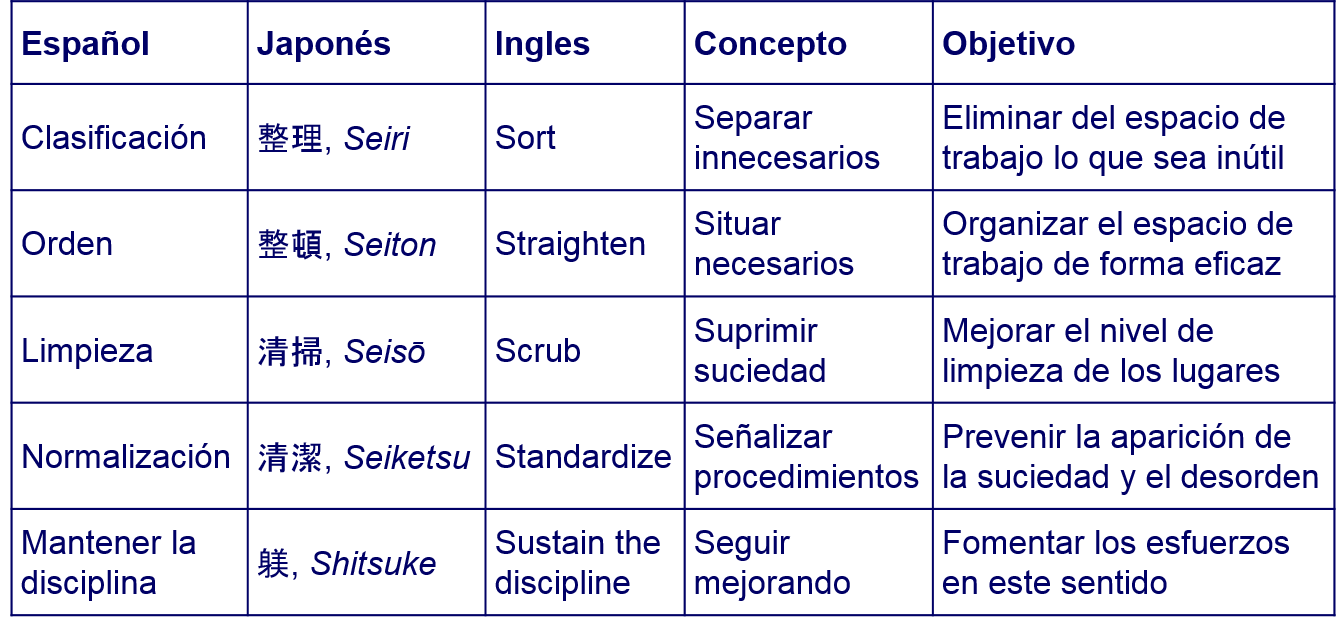 El método de las 5S utiliza una lista de cinco palabras japonesas que empiezan por S. La lista describe la forma de organizar un espacio de trabajo de un modo eficiente y eficaz mediante la identificación y almacenamiento de los componentes utilizados, la conservación adecuada de la zona de trabajo y los elementos almacenados, y el mantenimiento del nuevo estado.