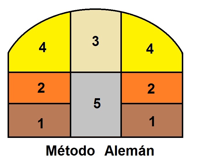 El método alemán es un procedimiento de construcción de túneles de grandes luces que también se emplea cuando el terreno es muy malo y resulta peligroso descalzar parte de la bóveda para ejecutar los hastiales, como ocurre con el método belga. Este procedimiento permite reaccionar con mayor rapidez que el método belga en caso de que aparezca agua, en terrenos sueltos o capas arenosas. Además, permite reducir los posibles asientos diferenciales que producirían grietas en la bóveda y asientos en la superficie.