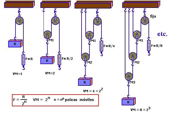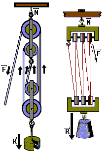 - Aparejo potencial: se combina un número cualquiera de poleas móviles con una fija. De acuerdo con la figura, la primera polea móvil, partiendo de abajo hacia arriba, reduce la fuerza necesaria para equilibrar la resistencia a la mitad de esta, la segunda polea reduce esta mitad a la cuarta parte, la tercera ala octava y así sucesivamente.