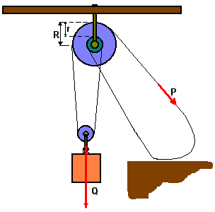 - Aparejo diferencial: consta de una doble polea fija, de radios desiguales y una polea móvil, poleas que se encuentran enlazadas por una cadena sin fin o cerrada. Cuando la doble polea fija, gira en el sentido de las agujas de un reloj, la polea fija de menor radio da cordel y la más grande toma; como al dar una vuelta la polea pequeña da menos de lo que la grande toma, la consecuencia es que P = Q(R-r)/2R.