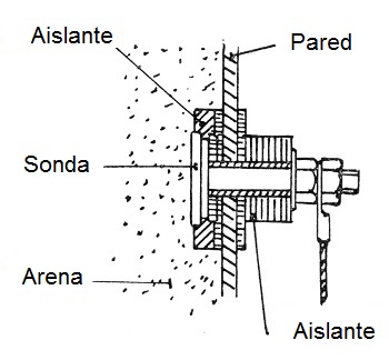 El fundamento es el siguiente: La resistencia de la arena al paso de la corriente eléctrica varía según la humedad de la misma. El aparato receptor es un miliamperímetro tarado en % de 1 a 12, que indica el valor de la corriente que pasa atravesando el material a examinar, desde un electrodo colocado en la sonda hasta un cable unido a la masa de la tolva.