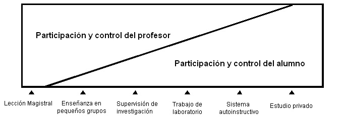 Antes de abordar los criterios de selección de las técnicas docentes, en los que se apoya la propuesta concreta recogida en los programas de las asignaturas, se describen, a modo de ejemplo, dos de las posibles clasificaciones de dichas técnicas. Brown y Atkins (1988) clasifican los métodos formativos de forma continua (ver Figura). En un extremo se encuentran las lecciones magistrales, con una participación y un control del estudiante mínimos. En el otro extremo se sitúa el estudio autónomo en el que la participación y el control del profesor son usualmente mínimos. Con todo, se debe resaltar que incluso en cada uno de los extremos hay algo de control y participación por parte del profesor y del alumnado. Así, por ejemplo, en la lección magistral los estudiantes pueden elegir qué apuntes tomar o qué preguntas plantear. El aprendizaje autónomo puede asimismo estar influenciado por las indicaciones del profesor, los materiales, las tareas y los textos que se le han recomendado.