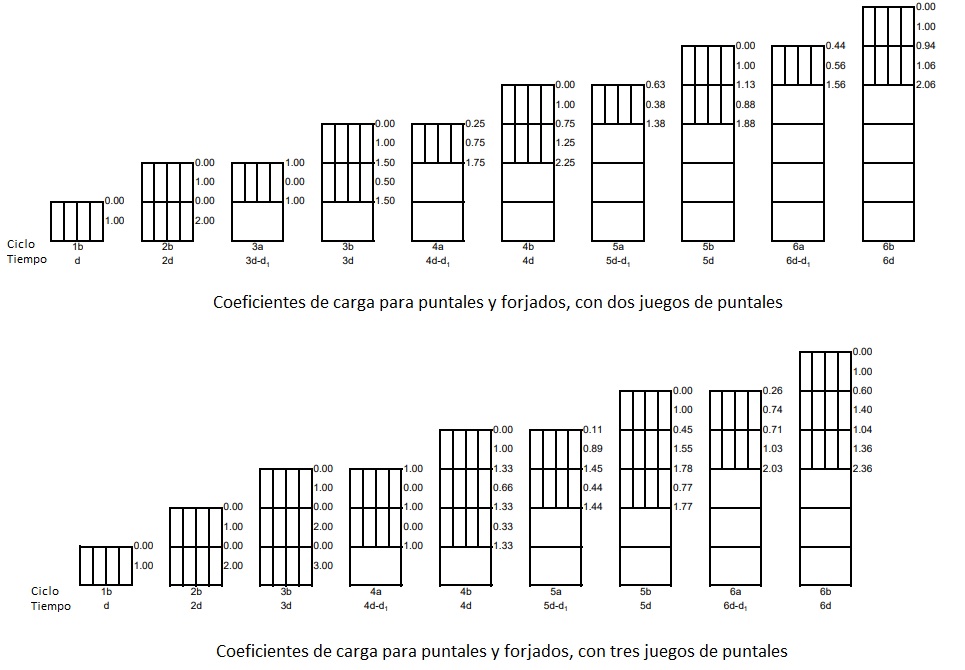 Con un par de reglas sencillas se puede utilizar este método simplificado. La primera regla es que, una vez se descimbra una planta, la carga que soportaban los puntales se reparten proporcionalmente a los forjados existentes, siempre y cuando los puntales no apoyen en el suelo. La segunda regla es que la carga que recibe el puntal de una planta se calcula de la siguiente forma: se suma la carga del puntal de la planta anterior más el peso propio del forjado y se le resta lo que absorbe dicho forjado. En la figura que sigue se pueden ven los coeficientes de carga para dos y tres juegos de puntales. Para dos juegos, la carga máxima en un forjado se sitúa en el nivel 2 con un coeficiente de 2,25; para tres juegos, la carga máxima se sitúa en el nivel 3 con un coeficiente de 2,36. Dejamos al lector el cálculo con cuatro juegos: la máxima carga sería en el nivel 4 con un coeficiente de 2,43. Se observa que el valor máximo aparece siempre en la planta n, siendo n el número de plantas apuntaladas, es decir, la planta más cargada es la última que fue hormigonada con puntales hasta el terreno.