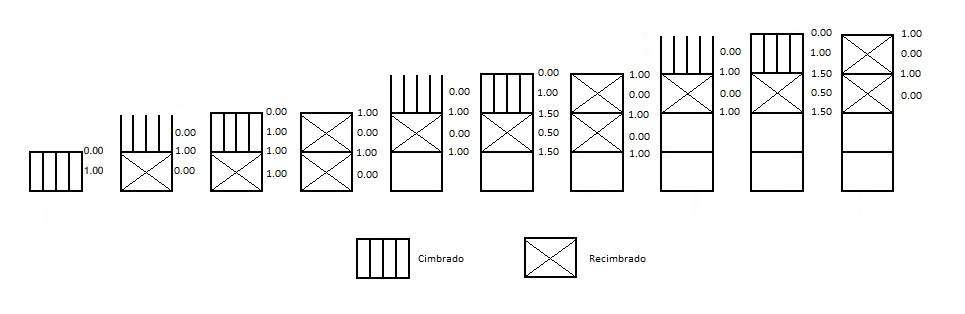 Taylor (1967) determinó que los coeficientes del método simplificado de Grundy y Kabaila podrían ser reducidos usando la técnica del recimbrado. Se añade una fase más donde se liberan los puntales y los forjados absorben todos los esfuerzos. Al volver a colocar los puntales en carga, éstos solo trabajarán ante cargas adicionales. En la figura siguiente se han calculado los coeficientes para dos juegos de puntales. Se observa que la carga máxima en forjados en este caso es de 1,5 veces el peso del forjado. Dejamos para el lector el cálculo para tres juegos, donde la carga es menor, de solo 1,33 veces el peso del forjado. Como conclusión, sin recimbrado lo mejor eran dos juegos de puntales y con recimbrado, tres juegos.