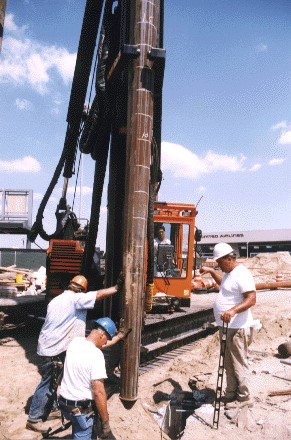 La hinca se realiza con un mandril solidario con el tubo, sobre el cual actúa la maza. El mandril es un vástago metálico que se introduce en este tipo de pilotes de acero huecos durante la hinca para evitar la abolladura. Realizada la hinca, se extrae el mandril del pilote y el tubo se rellena de hormigón, con o sin armadura. En la Figura 1 se aprecia el proceso previo de hinca de este tipo de pilote.