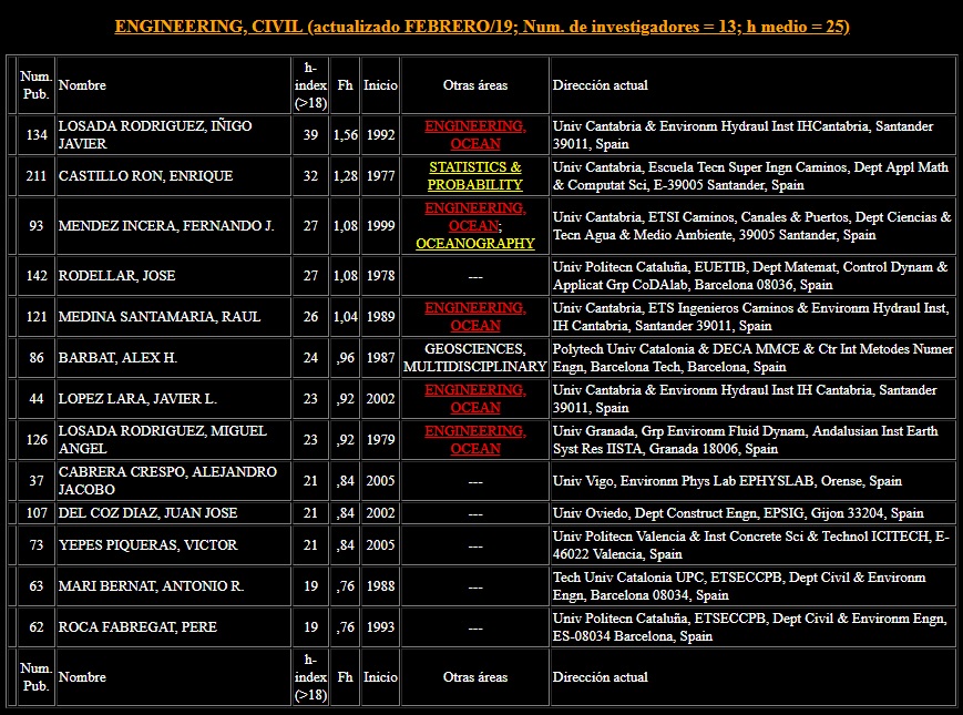 Para poner un ejemplo de cómo se pueden ver los listados de científicos de un área determinada, voy a utilizar la relativa a CIVIL ENGINEERING, que es a la que pertenezco por mis líneas de investigación. En la imagen de abajo se puede ver el listado correspondiente a los investigadores residentes en España de este área de conocimiento. En dicha lista solo aparecen los investigadores con un índice h igual o superior a 19. En este caso, aparecen 13 investigadores, cuyo índice h medio es de 25. En cambio, en otra área como es CONSTRUCTION & BUILDING TECHNOLOGY, el indicador h medio es de 30. De esta forma, se puede calcular un índice relativo Fh, como cociente entre el índice h de este campo respecto a la media de esta lista. De esta forma, se pueden comparar investigadores de distintas áreas de conocimiento (por ejemplo, un investigador con h=21 en CIVIL ENGINEERING, está mejor posicionado de forma relativa en su Fh que otro con h=25 en CONSTRUCTION & BUILDING TECHNOLOGY). Os recomiendo que visitéis la página del Grupo DIH para que veáis todo el estudio y los detalles.