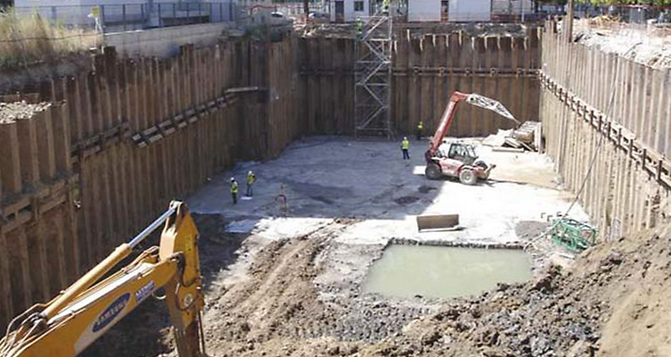 Figura 1. Vaciado de solar en recinto apantallado bajo nivel freático. https://www.obrasurbanas.es/pantallas-tablestacas-excavaciones/