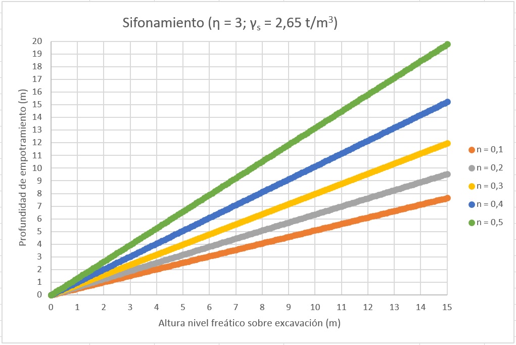 En la Figura 3 se representa la evolución del empotramiento en función de la profundidad de la excavación bajo nivel freático y de la porosidad del suelo. Se ha supuesto γs = 2,65 t/m3 y un coeficiente de seguridad η = 3. Es fácil comprobar la relación lineal entre el empotramiento y la altura del nivel freático sobre la excavación. Además, cuanto más poros presenta el terreno, más empotramiento es necesario.