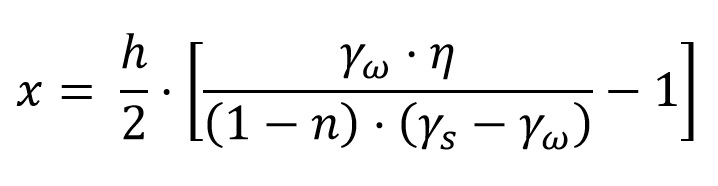 Supongamos que nos dan como datos el peso específico de las partículas sólidas de un suelo «γs » y su porosidad «n«. El peso específico del agua es «γw«. Vamos a considerar un coeficiente de seguridad «η«. Como el gradiente es h/(h+2x), se puede comparar con el gradiente crítico dividido por su coeficiente de seguridad. De este modo, es fácil demostrar que la longitud de empotramiento es: