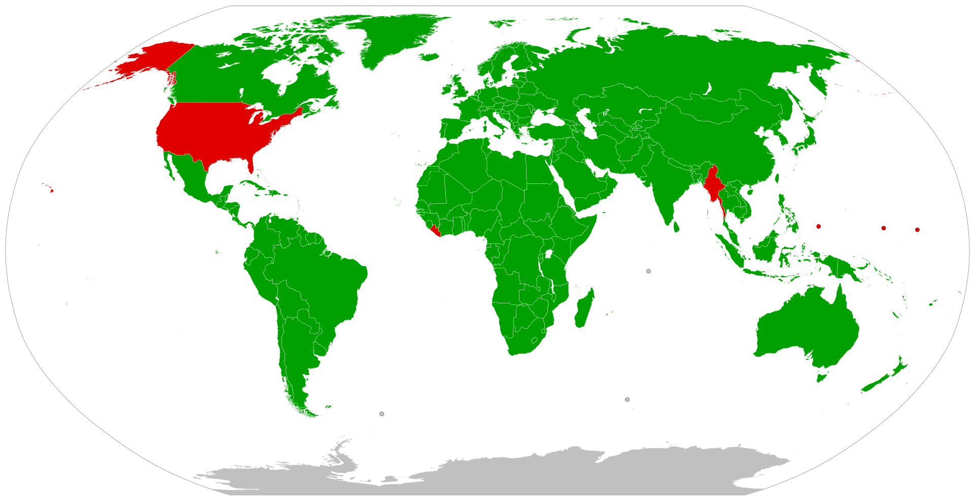 En verde, los países que han adoptado el Sistema Internacional de Unidades como prioritario o único. Los tres únicos países que en su legislación no han adoptado el SI son Birmania, Liberia y Estados Unidos. Wikipedia