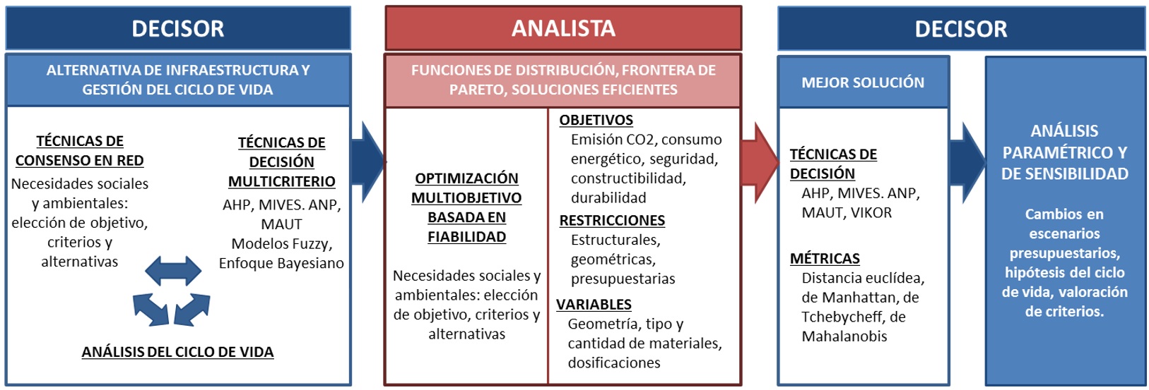 La investigación combina técnicas y disciplinas diversas tales como el análisis estructural, la toma de decisiones multicriterio, la optimización heurística multiobjetivo, el análisis del ciclo de vida, el análisis basado en fiabilidad, el diseño óptimo robusto, los metamodelos y las técnicas de minería de datos. Por tanto, se trata de una combinación integrada cuyo objetivo es la priorización del tipo de diseño, o bien de su mantenimiento, basándose en criterios de sostenibilidad social y ambiental bajo presupuestos restrictivos, considerando la variabilidad inherente a los problemas reales. Los trabajos desarrollados en proyectos anteriores se centraron en la optimización con múltiples objetivos, empleando técnicas sin información a priori del decisor. En este caso, la optimización proporciona alternativas eficientes al decisor. También ha utilizado técnicas con información a priori, donde el decisor informa sobre las preferencias al analista, que optimiza su modelo. En la metodología propuesta (Figura 1) se utiliza un enfoque mixto e interactivo, donde el decisor proporciona información sobre las preferencias al analista que, tras una optimización multiobjetivo basada en fiabilidad y metamodelos, aporta un conjunto de soluciones eficientes que el decisor debe evaluar antes de tomar su decisión. Por tanto, la novedad de la propuesta metodológica trifase se basa en la integración de técnicas de información a priori, donde el decisor (grupos de interés) informa de las preferencias al analista (en cuanto a tipologías, métodos constructivos, conservación, etc.), produciéndose con esta información una optimización multiobjetivo capaz de generar alternativas eficientes utilizando la variabilidad en los parámetros, variables y restricciones. La última fase pasa por un proceso de información a posteriori para que el decisor contemple aspectos no considerados en la optimización para dar la solución final completa.