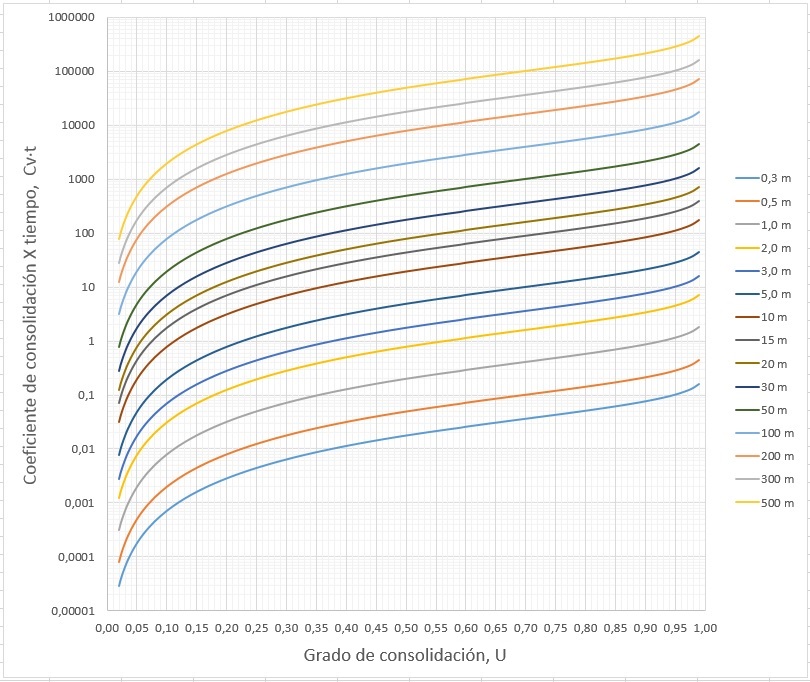 Por tanto, se puede saber el tiempo que tardará en asentar un suelo saturado para alcanzar un grado de consolidación determinado conociendo la distancia libre de drenaje y el coeficiente de consolidación vertical. Los cálculos pueden realizarse rápidamente utilizando la gráfica de la Figura 4. Se ha dibujado el eje vertical en escala logarítmica. Cada función indica una longitud libre de drenaje distinta.