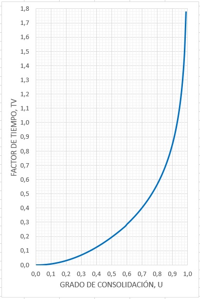 Estas expresiones las hemos dibujado en la Figura 3, donde se relaciona U con Tv. Se puede observar que para el grado de consolidación del 100%, el factor de tiempo se hace infinito. No obstante, se puede considerar que un factor de tiempo Tv = 2 corresponde prácticamente al final de la consolidación primaria.