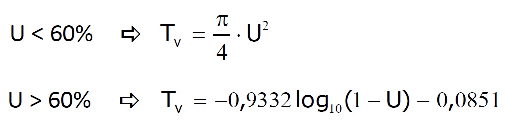Si llamamos factor de tiempo a Tv, éste se encuentra relacionado con U. La solución simplificada de la ecuación diferencial, suponiendo que el incremento de presión total es uniforme o lineal en el caso del doble drenaje, nos lleva a dos ecuaciones sencillas, que son las siguientes: