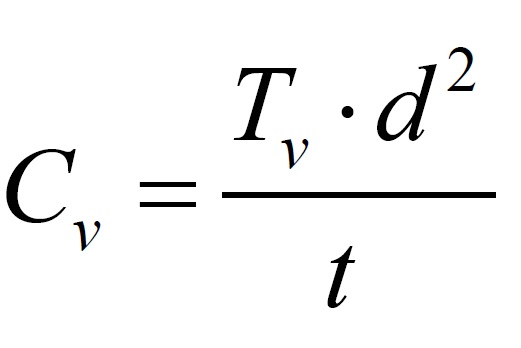 donde Cv es el denominado coeficiente de consolidación vertical, que depende del nivel de tensiones existente y cuyas unidades son [L2]/[T]. Este coeficiente en una arcilla puede deducirse de un ensayo edométrico de una muestra inalterada. Su valor tipo oscila entre 0,4 x 10-4  y 3 x 10-3 cm2/s, y los valores deducidos in situ oscilan entre 0,7 x 10-4  y 250 cm2/s (González Caballero, 2001).