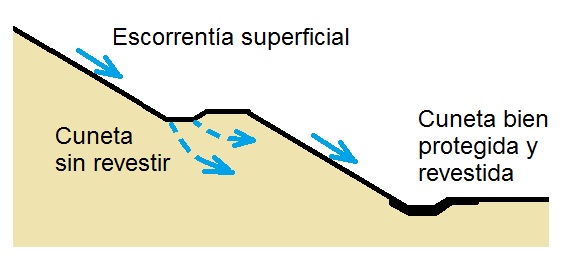 - Erosión superficial: Cuando el agua aflora en los taludes de una excavación provoca cárcavas por arrastre del terreno que comprometen su estabilidad y por otra parte debilita las bermas construidas en taludes altos (Figura 5). La solución consiste en proteger la coronación y las bermas de los taludes con cunetas impermeables o drenes que reciban el agua y la conduzcan a puntos de recogida y bombeo, especialmente cuando el talud va a ser permanente. Este fenómeno erosivo también ocurre cuando la superficie freática no baja lo suficiente e intersecta la cara del talud.