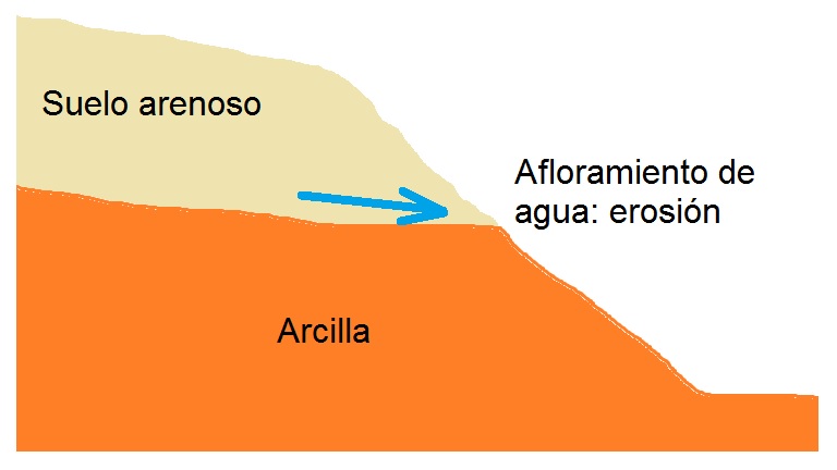 Este fenómeno se combina con la erosión, especialmente cuando la excavación corta dos estratos, siendo el inferior impermeable en comparación con el superior, lo que provoca un flujo de agua entre capas que puede provocar fenómenos de erosión tanto superficial como interna (Figura 4). Se podría solucionar el problema con taludes de excavación más tendidos o bien con una barrera (tablestacado, muro pantalla, entre otros).