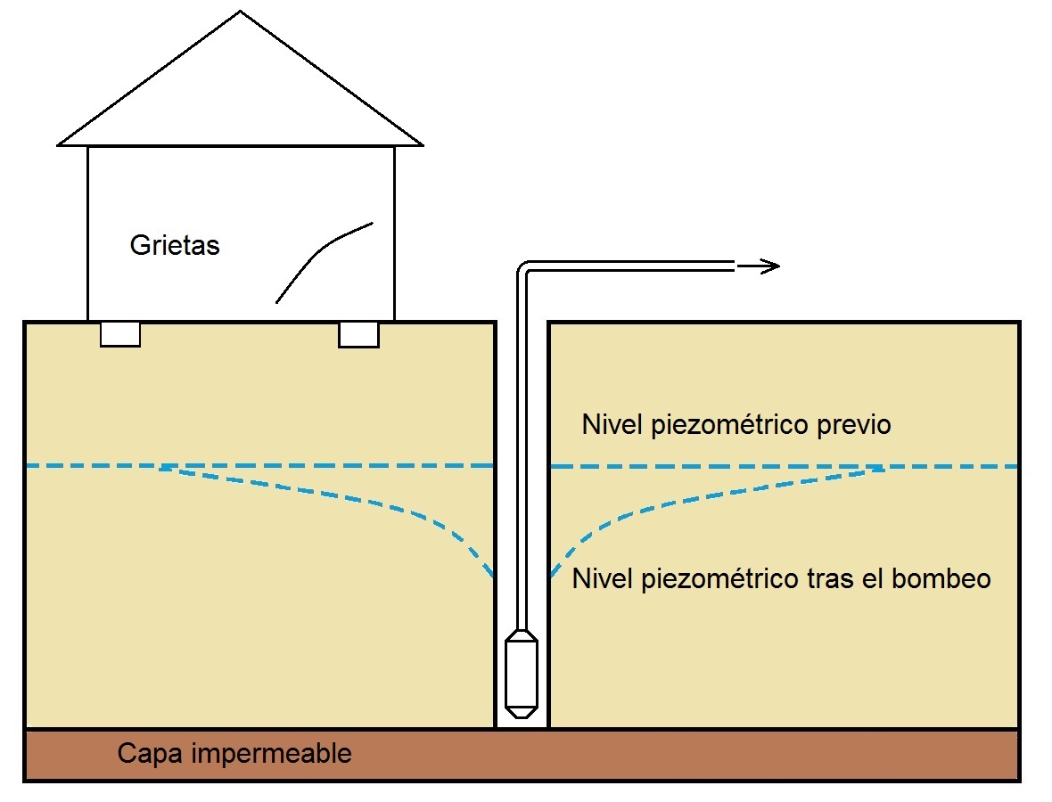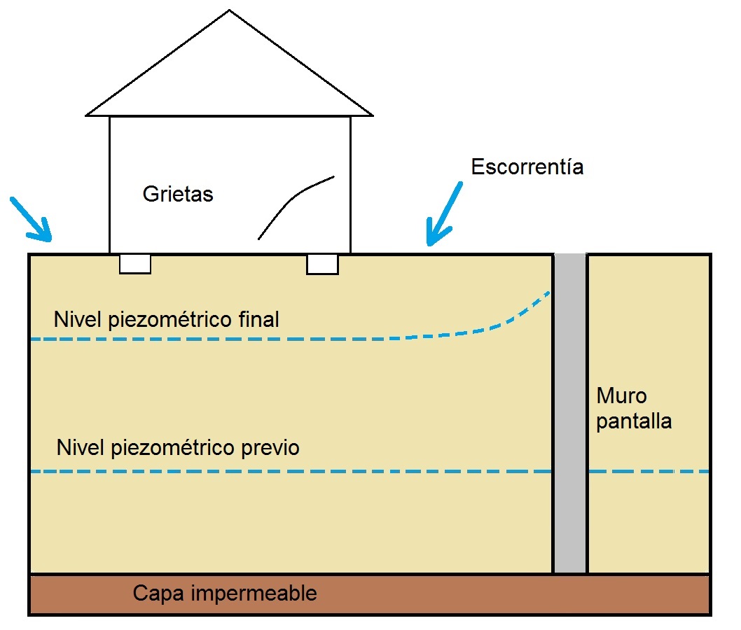 - Subsidencia: En el caso de un descenso del nivel freático, el postulado de Terzaghi nos indica que el aumento de las tensiones efectivas provocará asientos. Esta disminución puede ser debida a un bombeo, previo o no, a una excavación (Figura 2). Análogamente, un aumento en el freático puede provocar asientos en un suelo arcilloso si éste disminuye su consistencia, o bien en arenas al reducir su capacidad portante. El aumento, por ejemplo, puede deberse a una fuga de la red de agua potable, a un aumento repentino de aguas superficiales por lluvias o, como se ve en la Figura 3, a la ejecución de un muro pantalla. En este caso, las grietas pueden aparecer tanto por el debilitamiento del terreno durante la excavación como cuando el muro pantalla hace de barrera al agua. Asientos del orden de 1 mm/año no exigen tratamiento de urgencia, pero si son del orden de 1 mm/mes, implican un riesgo notable. Asientos de 1 mm/año pueden provocar daños ligeros en la tabiquería, que son notables, dependiendo si el proceso se estabiliza o no, cuando son de 1 mm/mes y que llegan a graves si el asiento es de 2 mm/mes.