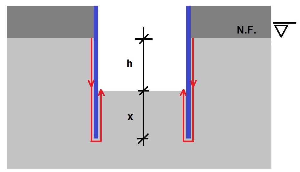 - Levantamiento de fondo o taponazo (uplift): El fondo de la excavación se puede volver inestable cuando el peso del terreno no es capaz de equilibrar al empuje del agua (Figura 9). Es típico de un estrato de baja permeabilidad (como una arcilla o roca de baja permeabilidad sin fisuras) situado sobre un acuífero confinado de mayor conductividad hidráulica (como una grava, muy permeable). Suele resolverse el problema con pozos de alivio.