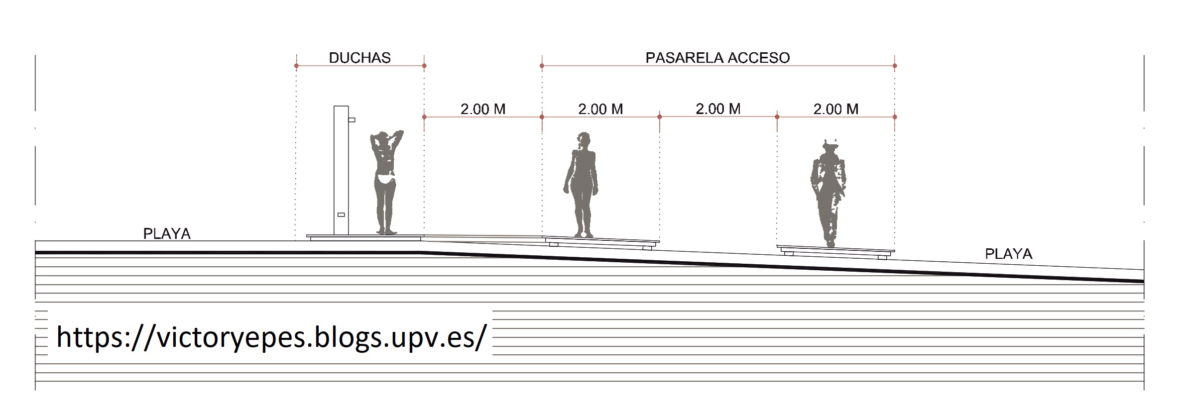 Empecemos por lo más sencillo. Cuando se accede a una playa, normalmente se hace por una pasarela. La gente se cruza, los que van con los que vienen. Pues lo inmediato es duplicar las pasarelas de acceso a la playa, de forma que, tanto para salir como para entrar, los usuarios circulen por su derecha. En la Figura 3 os paso un esquema de esta disposición. Las dos pasarelas estarían separadas la distancia mínima de seguridad (2-3 m). La de salida de bañistas es la que debería estar junto a las duchas o lavapiés (cuyas condiciones de uso es un tema a tratar aparte).