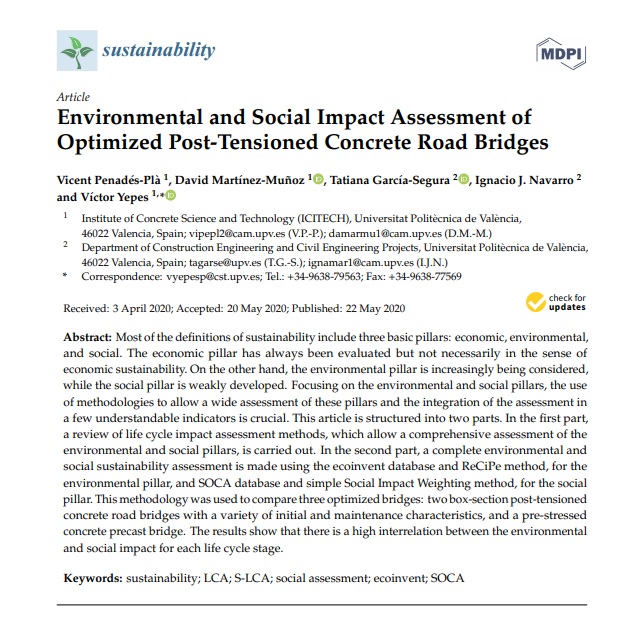 PENADÉS-PLÀ, V.; MARTÍNEZ-MUÑOZ, D.; GARCÍA-SEGURA, T.; NAVARRO, I.J.; YEPES, V. (2020). Environmental and social impact assessment of optimized post-tensioned concrete road bridges. Sustainability, 12(10), 4265. DOI:10.3390/su12104265