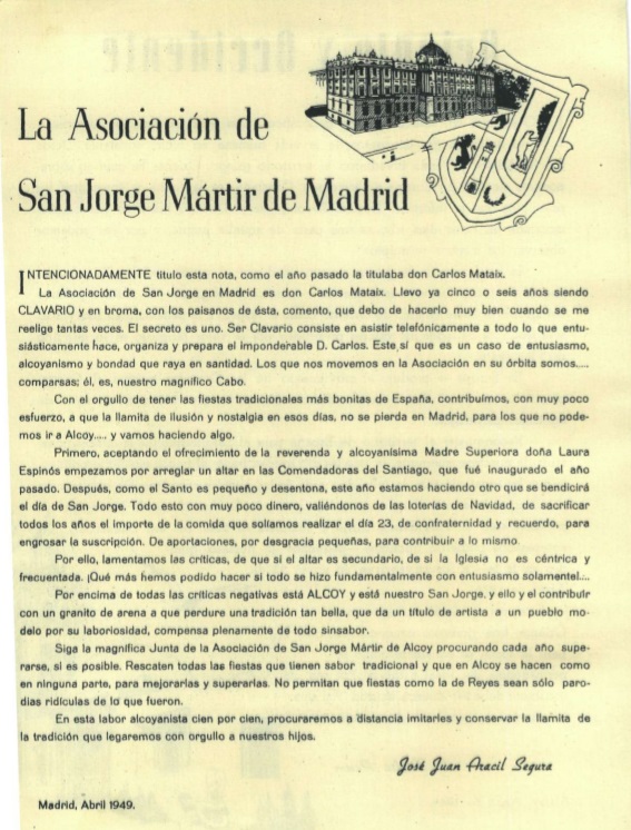 Como curiosidad del carácter alcoyano de D. José Juan-Aracil, baste recordar el homenaje que se le rindió el 27 de noviembre de 1980 en un céntrico restaurante madrileño por parte de la Asociación de San Jorge en la capital de España. Juan-Aracil fue el presidente (clavario) de esta Asociación alcoyana en Madrid. Os dejo a continuación un par de textos escritos en 1949 sobre la Asociación de San Jorge Mártir de Madrid y otro de 1951 sobre Alcoy y el Cuerpo de Ingenieros de Caminos, ambos de la Revista de la Asociación de San Jorge.