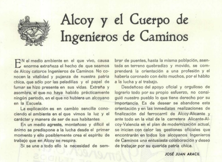 Salvando las diferencias generacionales y de contexto, siempre me ha sorprendido las coincidencias biográficas que he tenido con la figura de D. José Juan-Aracil Segura. Aunque no tuve la suerte de conocerlo personalmente (falleció en 1982, el año en que comenzaba yo la carrera), ambos somos ingenieros de caminos nacidos en Alcoy (Alicante), con el número 1 de promoción en ambos casos y curiosamente, con hijos que también son ingenieros de caminos. Además, hemos sido catedráticos de universidad de la misma asignatura. En efecto, Juan-Aracil fue el catedrático de esta asignatura que en los años cuarenta se denominaba “Maquinaria y Medios Auxiliares de Obra” en la Escuela de Ingenieros de Caminos de Madrid, asignatura que luego fue cambiando de nombre hasta llegar a la de «Procedimientos Generales de Construcción y Organización de Obras«. También en esta asignatura imparto docencia en la Escuela de Valencia. A diferencia de otro tipo de asignaturas (Hormigón, Geotecnia, Materiales de Construcción, etc.), las asignaturas de Maquinaria y Medios Auxiliares, o bien de Procedimientos de Construcción, han sido impartidas en las distintas escuelas, mayoritariamente, por profesores asociados, muy ligados a las empresas constructoras. Es por ello que son pocos los catedráticos en España de esta materia. De hecho, José Luis Juan-Aracil López, su hijo, pasó a ser catedrático de la asignatura en Madrid, que la ejerció hasta su paso a Profesor Emérito. Os remito al siguiente artículo donde expliqué en su día los antecedentes históricos de la asignatura.