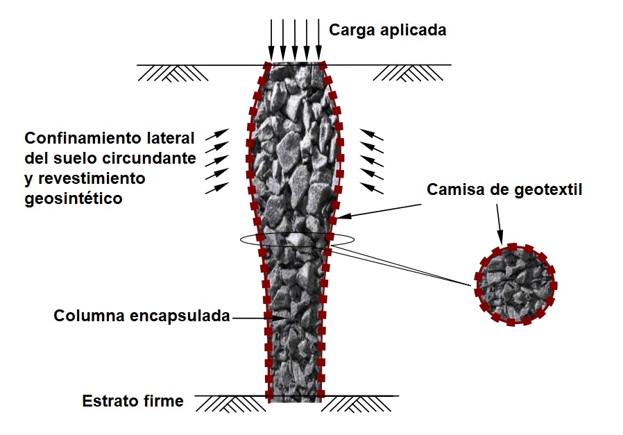 Un tratamiento habitual en suelos arcillosos blandos es la utilización de columnas de grava. Sin embargo, si los suelos son extremadamente blandos, el confinamiento lateral que ofrece el suelo circundante puede ser inadecuado para conformar la columna, lo que provocará asientos superficiales más acusados, disminuyendo de esta forma la eficacia de las columnas de gravas. Una posibilidad de mejorar el rendimiento de las columnas de grava es envolverla con un geosintético adecuado (geomalla o geotextil) de forma tubular (Figura 1).