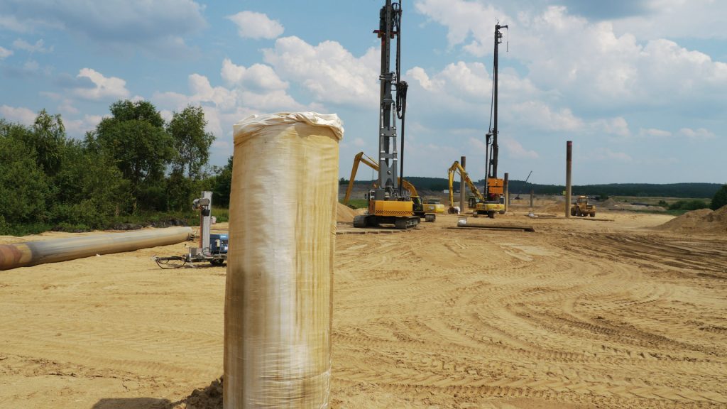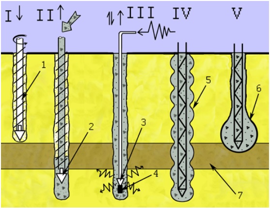 La técnica consiste en conducir o hacer vibrar un tubo de acero de 80 cm de diámetro en el terreno, seguido por la colocación de un geotextil cilíndrico cerrado inferiormente, con una resistencia a la tracción comprendida entre 200 y 400 kN/m. Este tubo se incrusta unos 0,5 m en el estrato competente. A continuación, se introduce arena o grava para formar una columna y se retira la camisa de acero. El principio básico de esta técnica es aliviar la carga sobre el terreno blando sin alterar sustancialmente la estructura del suelo. El sistema actúa como drenaje y como pilote. La columna transfiere la carga a los estratos portantes, limitando la carga sobre el terreno blando, acotando los asientos. A menudo se coloca en la parte superior de los pilotes una capa de refuerzo para mejorar la distribución de la carga.