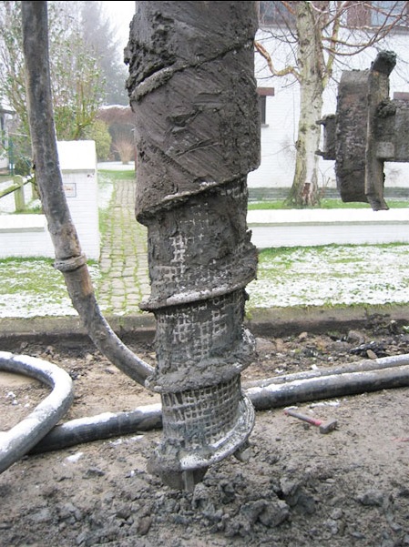 La perforación se realiza con una barrena hueca que desplaza el terreno horizontalmente, sin vibraciones ni producción de desechos. La inyección del mortero u hormigón se realiza por el interior de la barrena, de abajo a arriba, con presiones moderadas (normalmente inferior a 0,5 MPa) y garantizando la continuidad del hormigonado. La resistencia del hormigón o del mortero es de al menos 15 MPa. El módulo de deformación del mortero es de 5 a 30 veces menor que el del hormigón.