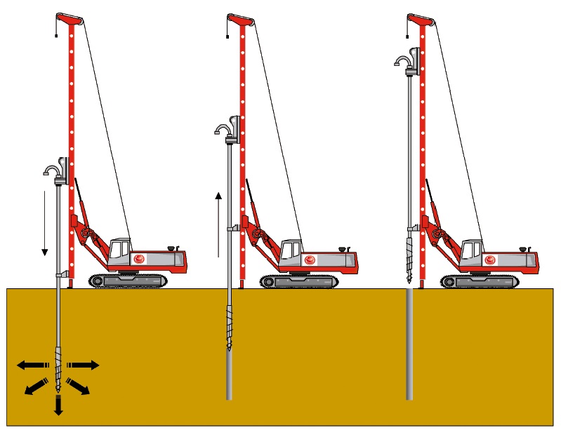 En la Figura 2 se observan las fases del procedimiento constructivo. La barrena se atornilla en el suelo hasta la profundidad especificada y luego se sube sin extraer el material. A continuación, se incorpora la lechada o mortero a través del taladro hueco. Cuando estas columnas soportan estructuras flexibles, como por ejemplo una solera, se termina con una capa granular de un espesor entre 40 y 80 cm. La capa de reparto también se puede estabilizar con cemento y, en el caso de cargas elevadas, pueden ser necesarios espesores de hasta 3,00 m combinados con geomallas de refuerzo.