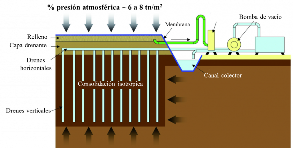 El sistema consiste en la instalación de una red de drenes horizontales y verticales bajo una membrana impermeable que permite, mediante bombeo al vacío del agua intersticial y del aire del terreno, un vacío en el terreno que equivale a una carga de 60 a 80 kPa (unos 3-4 m de arena). El agua se evacua por medio de zanjas perimetrales de confinamiento a las que se ancla la membrana. La profundidad del tratamiento se limita al espesor del depósito blando y la capacidad de la maquinaria, aunque los rangos habituales suelen ser de 10 a 35 m de profundidad, llegándose incluso a los 45 m. Los asientos residuales son poco significativos tras el tratamiento.