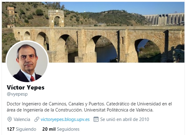 Hoy 12 de mayo se celebra el día del patrono de los ingenieros de caminos, canales y puertos, los ingenieros civiles y de los ingenieros de obras públicas, Santo Domingo de la Calzada. Coincide con el día en que mi cuenta de Twitter (@vyepesp) ha alcanzado los 20.000 seguidores. Este hito me obliga a agradecer profundamente a todos ellos su amor e interés por los temas que comento, que siempre están ligados a la ingeniería civil, la edificación y la construcción.