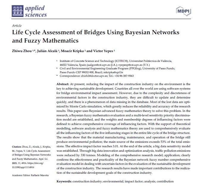 ZHOU, Z.; ALCALÁ, J.; KRIPKA, M.; YEPES, V. (2021). Life cycle assessment of bridges using Bayesian Networks and Fuzzy Mathematics. Applied Sciences, 11(11):4916. DOI:10.3390/app11114916