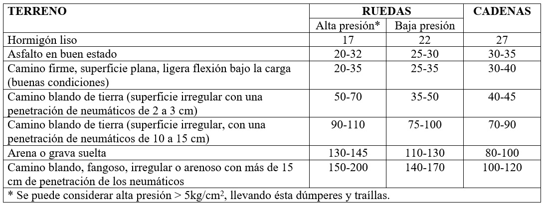 La resistencia a la rodadura se define como el esfuerzo que hay que vencer para mantener una velocidad constante sobre un tipo de terreno. Depende de la fricción interna del vehículo, de la resistencia que ofrece el terreno (a su vez dependiente de la consistencia del suelo y la presión del neumático) y del peso sobre la rueda. Queda expresado por la fuerza necesaria por unidad de peso del vehículo. Se puede estimar como resistencias internas de la máquina 20 kg/t y 15 kg adicionales por cada tonelada de peso y por cada 2,5 cm de penetración de los neumáticos. En la Tabla 1 se recogen los valores más utilizados de resistencia a la rodadura.